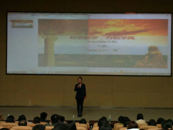 经过各院系的选拔,共有18位选手进入决赛,公司是张一鸣,丁莉两位同学。比赛过程中,公司两位选手充分围绕“学风建设”主题向大家明确阐述了自己的观点。张一鸣同学用她响亮的声音和从容不迫的演讲得到了在坐评委的肯定。随后出场的丁莉同学也在赛前做好了充分的准备,她轻松,自然的在舞台上展现出那流利的口才,赢得观众的阵阵掌声。最终,经过两个小时的激烈角逐,张一鸣同学荣获本次比赛的二等奖,丁莉同学也获得了三等奖的好成绩。