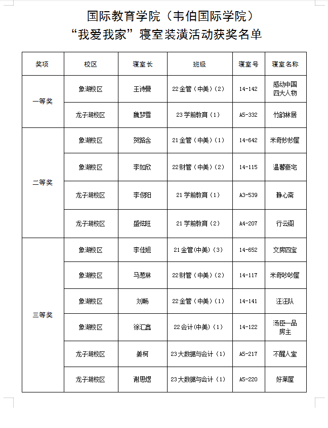 “我爱我家”寝室装潢活动获奖名单