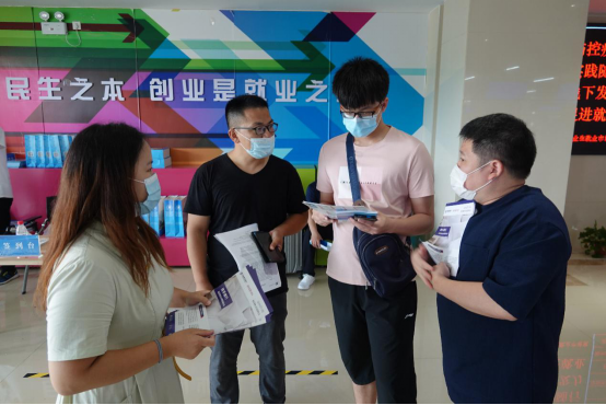 辅导员老师胡喜超陪同参会员工了解招聘企业详情