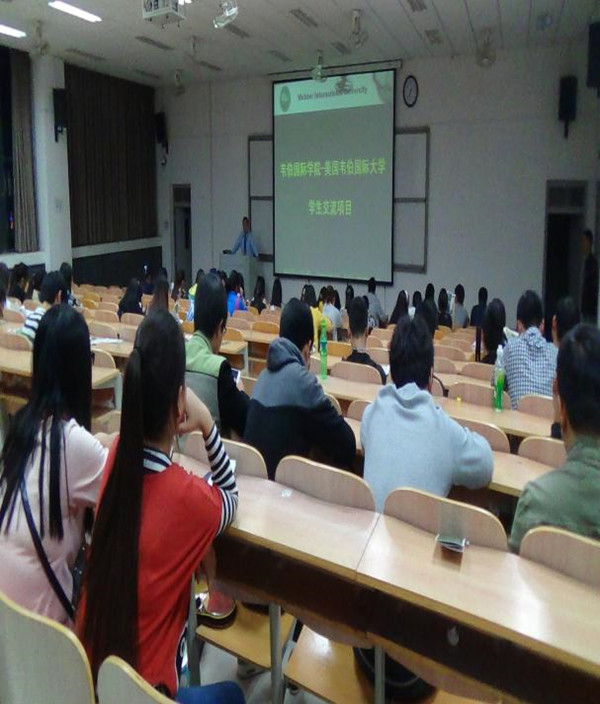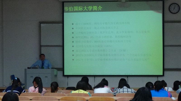 2014年10月31日晚上六点半,美国韦伯国际大学驻中国办事处在河南财专韦伯国际公司面向大一新生召开了韦伯国际大学留学说明会,美国韦伯国际大学驻中国办事处代表杨老师主持并出席了当天活动。