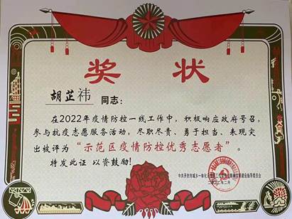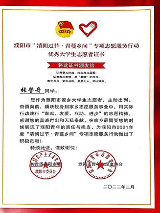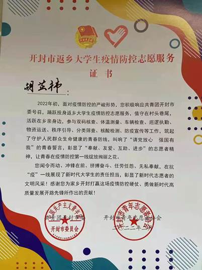 19级金管二班帖恒宇积极投身社区疫情防控,不惧严寒酷暑,始终奋斗在防疫一线。他还在河南广播电视台主办的大型公益寻亲融媒体活动《共和国不会忘记——传承红色基因我为烈士寻亲》中当选为烈士寻亲志愿者,跟随节目组辗转于河南湖北两省,让烈士英灵魂归故里,使红色基因永久流传。20级金管二班胡芷祎踊跃投身返乡老员工疫情防控志愿服务,参与了物资运送、人员排查、巡逻防控、应急值守、医学科普等行动,用实践行动叫响了“请党放心强国有我”的青春誓言。在韦伯国际公司党总支的大力支持与引领下,韦伯国际公司学子们积极行动2022年寒假期间,公司共有近200人次闻令而动、冲锋在前、拼搏奋斗、任劳任怨、无私奉献,在志愿服务家乡与社会中展现了新时代老员工的责任担当,彰显了新时代志愿者的文明风采,受到了当地各级政府和人民群众的一致赞誉和表扬!